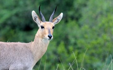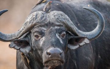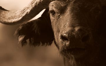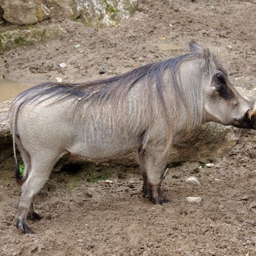 Description: An ugly pig-like animal, weighing up to 100 kg, and measuring 70 cm over the shoulder. It has a compact elongated body and long thin legs. The face is much flattened, with an expanded muzzle and two pairs of large warts, the upper immediately below the eye, the lower between the eyes and the tusks, which add to its characteristic ugly looks. Coat very sparse and bristly. Tusks very unusual, used by the Warthog as "weapons" and digging tools. It lives in holes in the ground.