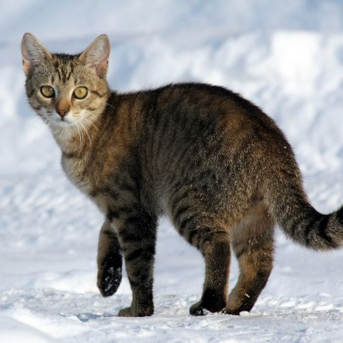 Description: The ancestor of our domestic cat, the Wild Cat weighs up to 15 kg, and measures up to 40 cm over the shoulder. It reaches a total body length of 80 cm, without tail (35 cm). The colour is very variable, from pale fawn or pale grey to ochre and brown. The underparts are white to buff. The black stripe along the spine may be strongly or weakly marked. The flanks have up to 12 vertical stripes continuing on the tail as rings.