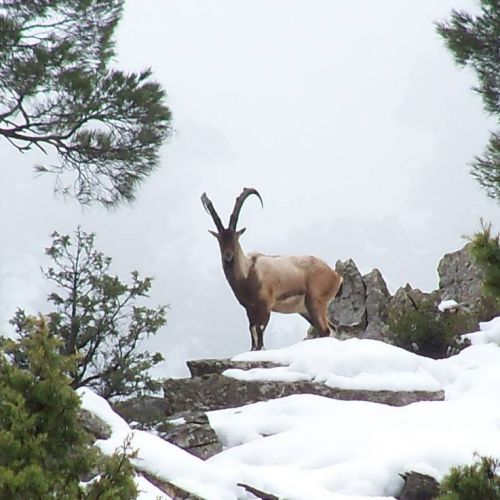 Description: Forerunner of all domestic goats, the Wild Goat has a compact body and long, strong legs. It weighs up to 90 kg and measures up to 1 meter over the shoulder. General colour rufous brown with a black line running down the spine. The horns are long, sabre shaped, pointing upwards and bending backwards. Both sexes have horns, but those of the male are the biggest. In older individuals the horns curve strongly backwards.
