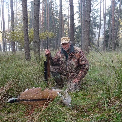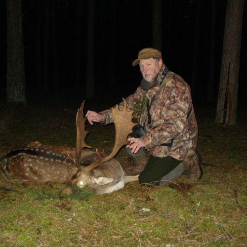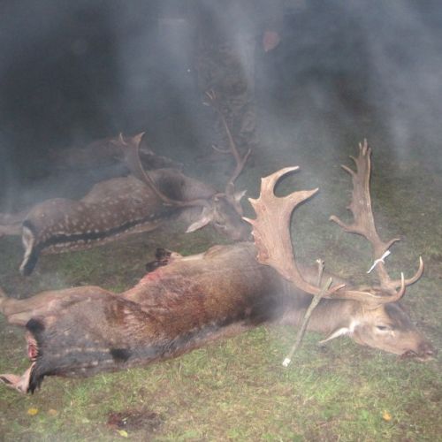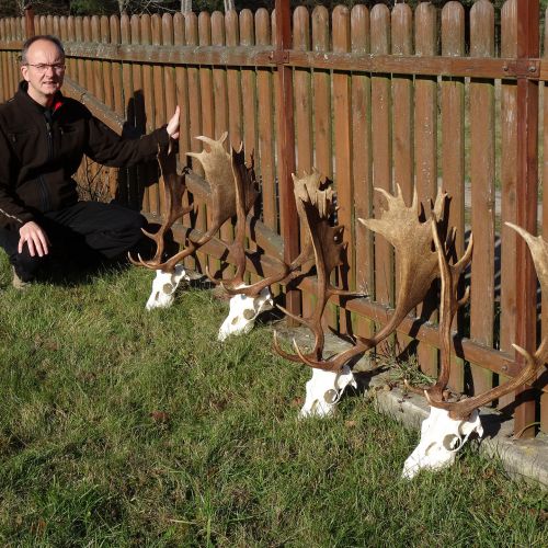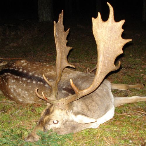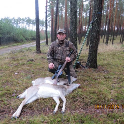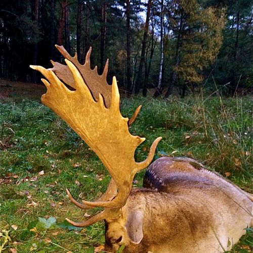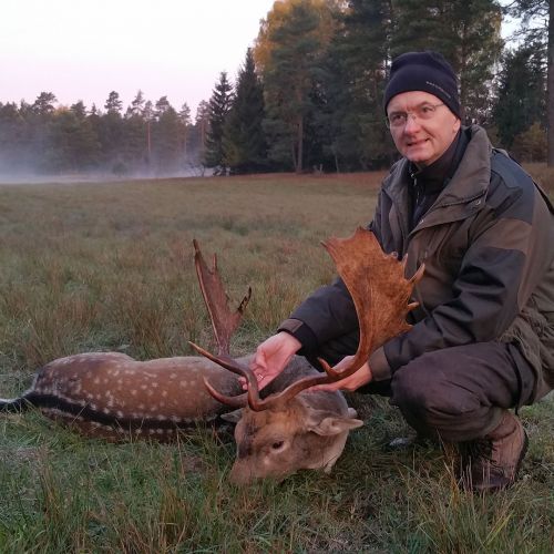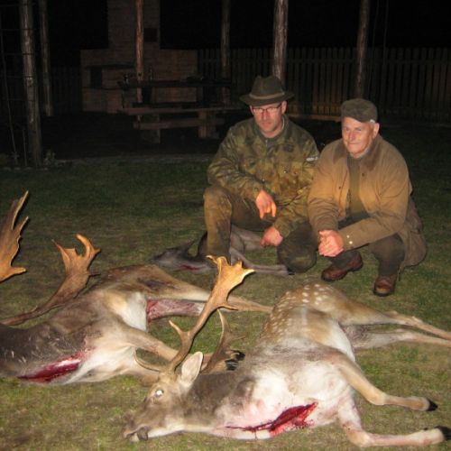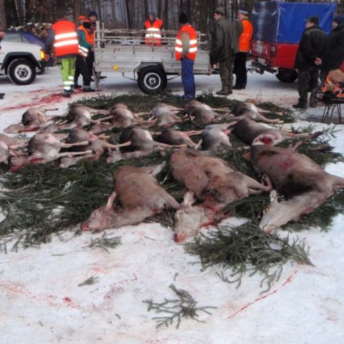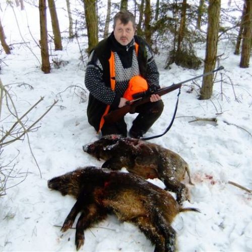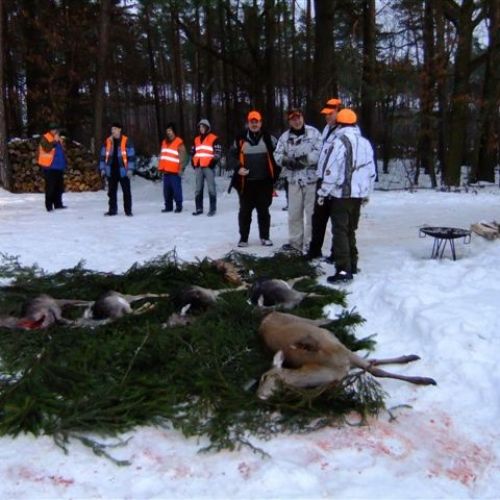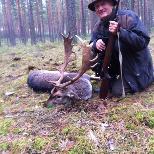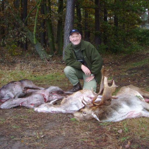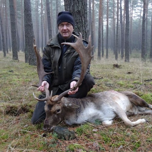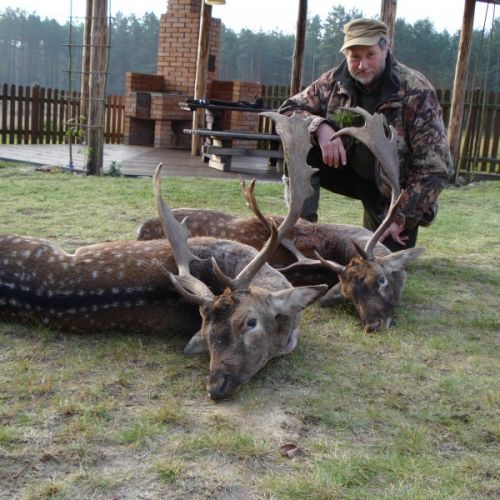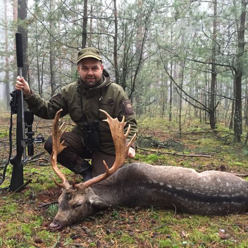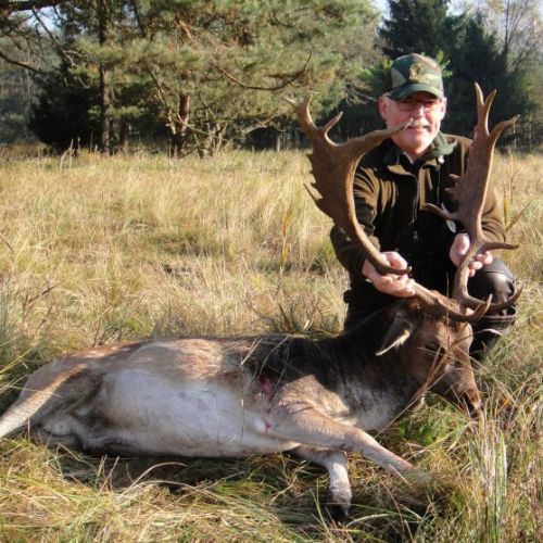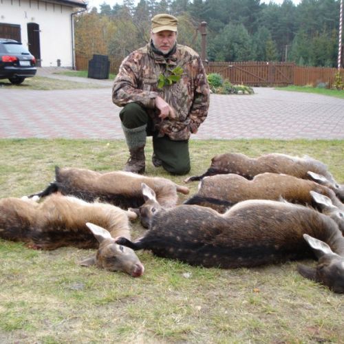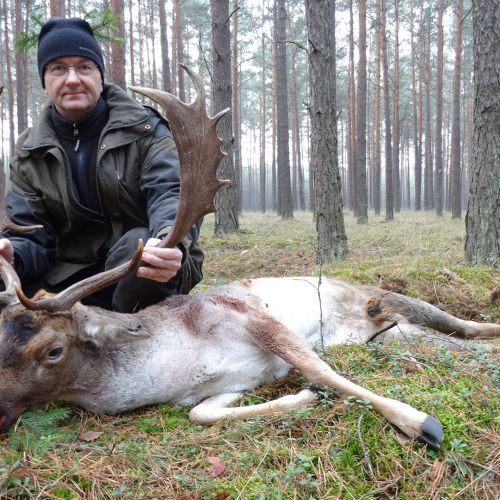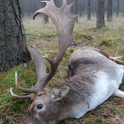 The district has a good population of fallow deer, with an annual harvest of approximately 50 animals. Dąbrowa also has good populations of red deer and wild boar, while the roe deer population is quite limited. Each year, about three roe bucks are taken. Dąbrowa also has a fine red deer population, with an annual quota of around 17 stags—most of them with a trophy weight of 4–6 kg, though some trophies exceed 6 kg each year. More than 20 fallow bucks are harvested annually, and they are typical Polish fallow deer, with some stags reaching or slightly exceeding a trophy weight of 3 kg. There is a reasonable population of wild boar in Dąbrowa, which are hunted both individually throughout the season and during driven hunts in autumn and winter.