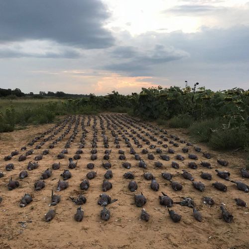 Pigeons arrive in thousands to feed in the fields full of ripe sunflowers. The season here stretches from February to the end of August. It is the experience of a lifetime to see so many pigeons coming from all directions and from every angle.